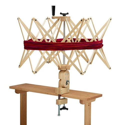 The Ultra Umbrella Swift is ingeniously designed to fit most tables. The Ultra turns freely on ball bearings and can be used vertically or horizontally. The wooden umbrella swift expands downward from the top to hold skeins up to 93″ in circumference.