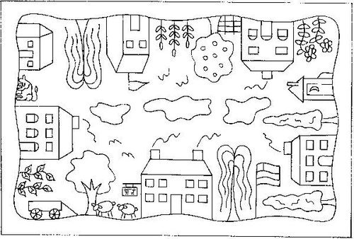 Shaker Village rug hooking pattern on Linen 34″ x 51″ by Melissa Elliot.
